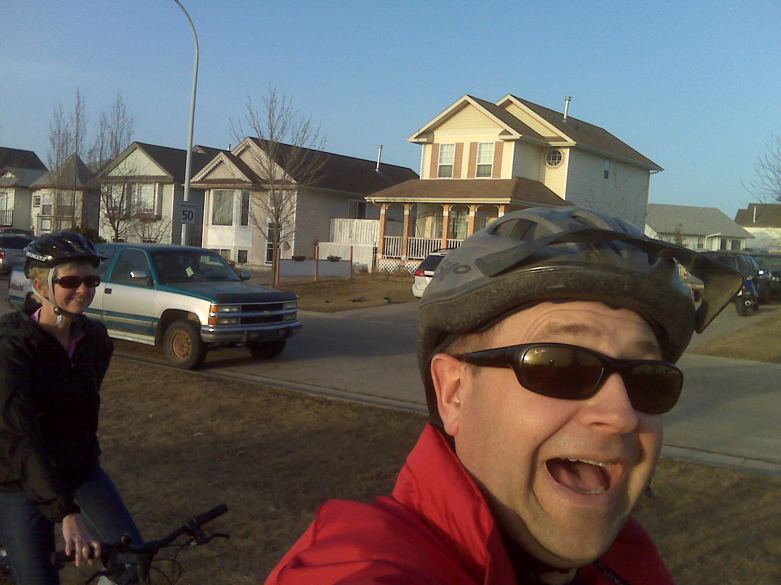Near as I can tell taking a picture while you are on the bike is not illegal. It was a great evening, 17 degrees and calm, and dry! Jan and I went for a nice bike ride. Very nice. Great to feel the bike again. Put the rack back on the car and we are ready for a summer of biking!