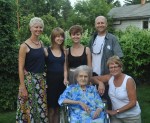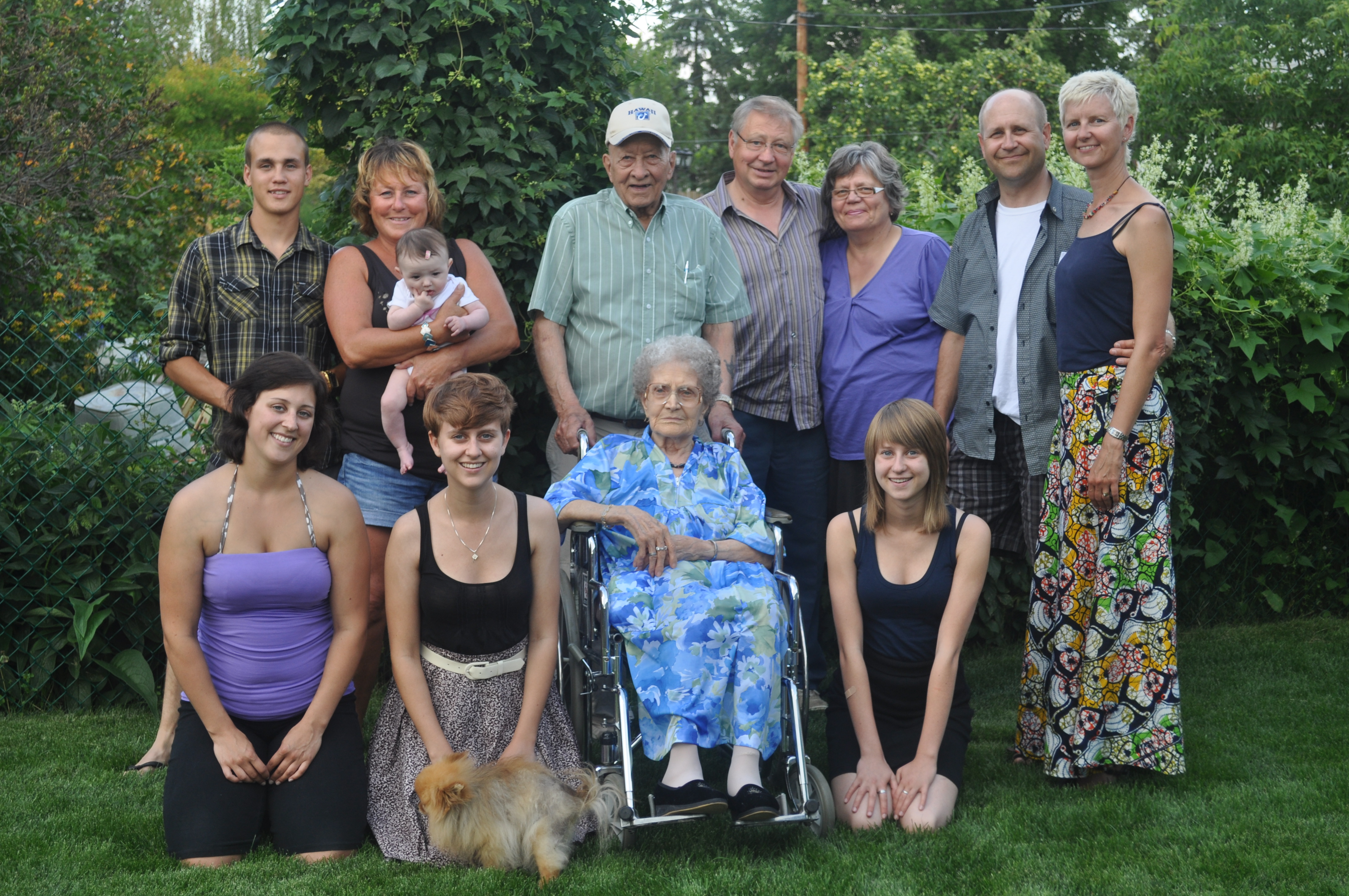 We had a nice BBQ party at my Mom’s house in Blaine Lake, Saskatchewan. In part it was a going away party for Karly – who leaves for Japan for a year August 14. Lots of relatives, dad was there, and my Grandma. Grandma Stasiuk lives in the middle of the Old Country, in Melfort. She came with my Aunt Carrie and her husband Henry. Grandma, who is 90 this fall, was in good spirits. She stayed for 3 hours or so before they headed back for the 90 minute drive home. Sure was special to have her. We had the usual sausage and burgers and salads. Mom did a great job hosting, ol Dad was a fine BBQ’er. The relatives were great, the going away cake was special, but one of the nicest parts – was having Grandma there.