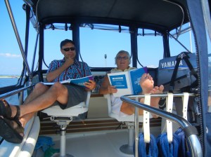 Next week Jan and I attend “District Governor training” in Boston. We were invited to Connie and Bernie Gervanski’s home, beforehand. Connie is also DG same time as me. They live on New York’s Long Island in a town called South Jamesport NY. A very pretty rural area. Today we are going into NY city. The past few days Connie and Bernie showed us around.. yesterday we went for a boat ride on their very cool boat. (sleeps 6!). In this pic Bonnie and I are reading our “District Governor Manual”. Yes indeed!